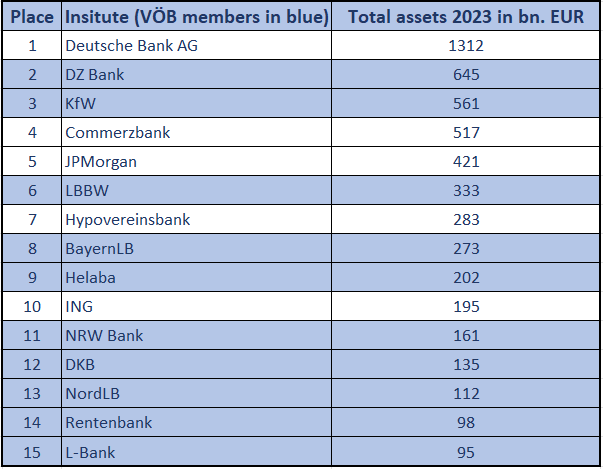 The Association of German Public Banks (VÖB) is a leading association of the German banking industry and belongs to the German Banking Industry Committee (GBIC)*. Our members cumulated total assets account to more than 3,029 billion euros, constituting approximately one quarter of the German banking market. They serve companies, SMEs, the public sector, and retail customers and are firmly rooted in their home regions in Germany. VÖB is also an employer association, our members employ more than 60.000 staff.