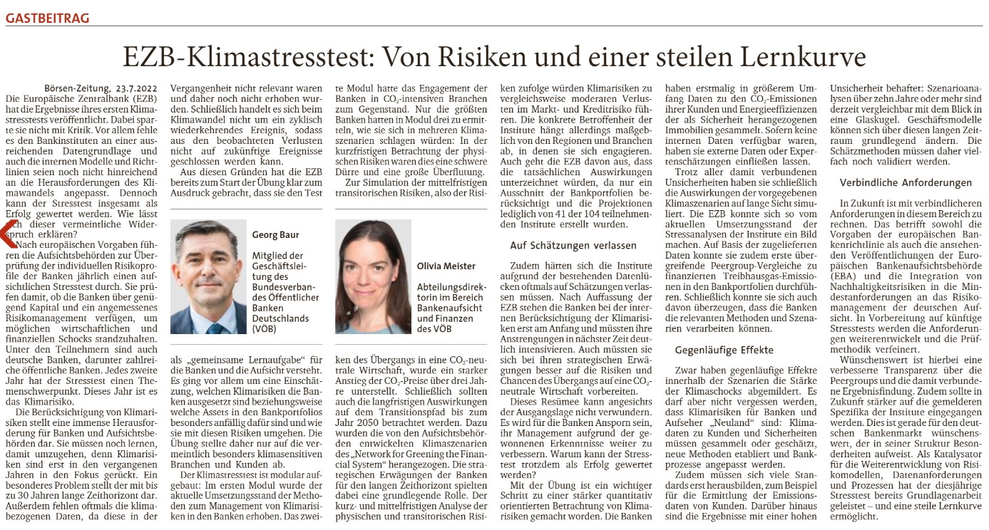 Im Gastbeitrag „EZB-Klimastresstest: Von Risiken und einer steilen Lernkurve“ erläutern VÖB-Geschäftsführer Georg Baur und VÖB-Expertin für Bankenaufsicht und Finanzen Olivia Meister in der Börsen-Zeitung die Besonderheiten des Klimastresstests der EZB, den wertvollen Erkenntnisgewinn und wie zukünftige Anforderungen aussehen werden.