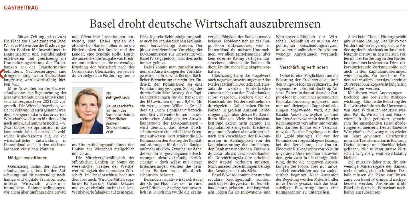 In einem Gastbeitrag in der Börsen-Zeitung mahnt VÖB-Hauptgeschäftsführerin Iris Bethge-Krauß, dass die Pläne zur Umsetzung von Basel IV drohen die deutsche Wirtschaft auszubremsen. Denn Basel IV erschwert die Kreditvergabe der Banken für Investitionen in Digitalisierung und Nachhaltigkeit und behindert gleichzeitig die Unterstützungsleistung der Förderbanken bei der Transformation. Nachbesserungen sind dringend nötig, wenn Deutschland langfristig wettbewerbsfähig bleiben will.