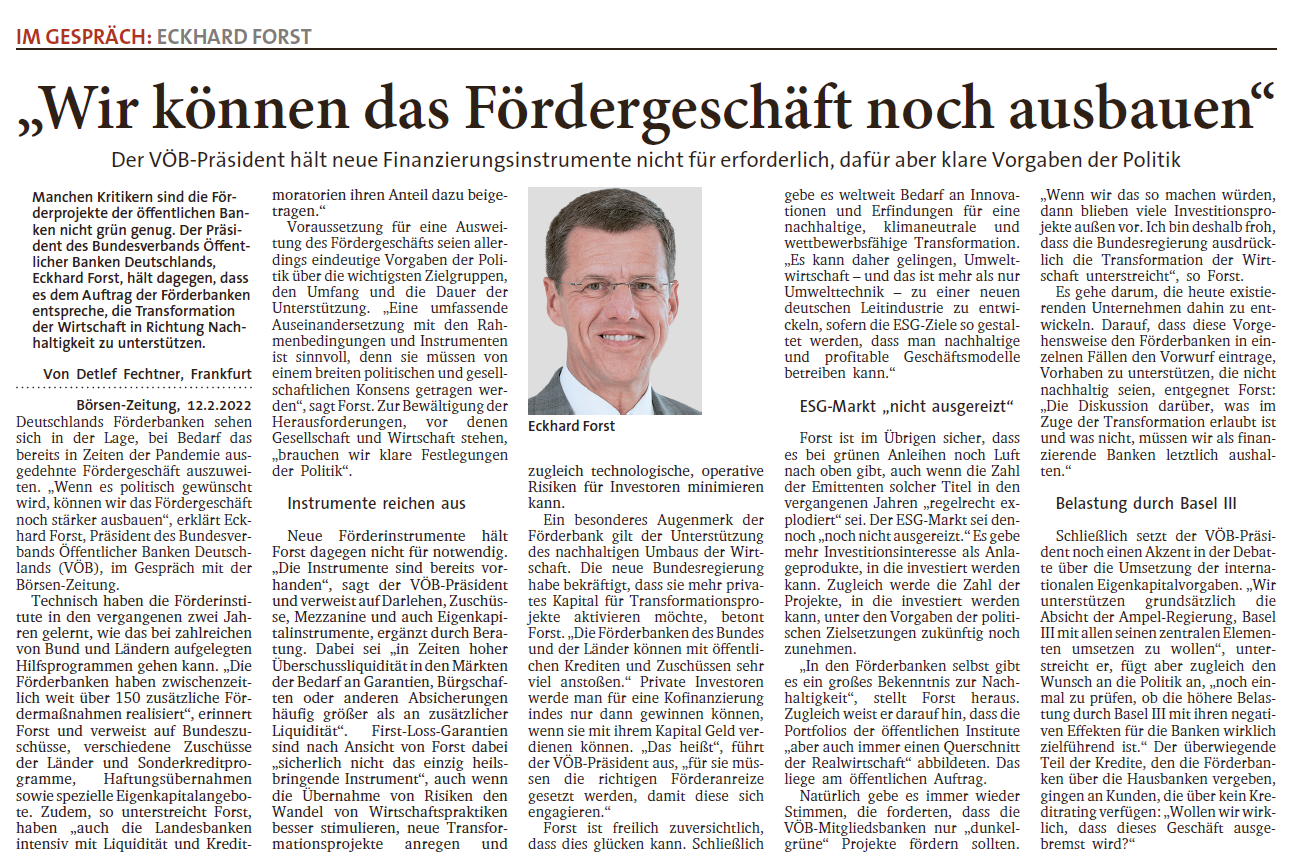 „Wenn es politisch gewünscht wird, können wir das Fördergeschäft noch stärker ausbauen. Technisch haben wir in den vergangenen zwei Jahren gelernt, wie das bei zahlreichen von Bund und Ländern aufgelegten Hilfsprogrammen gehen kann. Die Förderbanken haben zwischenzeitlich weit über 150 zusätzliche Fördermaßnahmen realisiert. Angefangen bei den Bundeszuschüssen über verschiedenste Zuschüsse der Länder bis hin zu Sonderkreditprogrammen, Haftungsübernahmen und speziellen Eigenkapitalangeboten. Auch die Landesbanken haben intensiv mit Liquidität und Kreditmoratorien ihren Anteil dazu beigetragen“, erklärt VÖB-Präsident Eckhard Forst im Gespräch mit der Börsen-Zeitung.