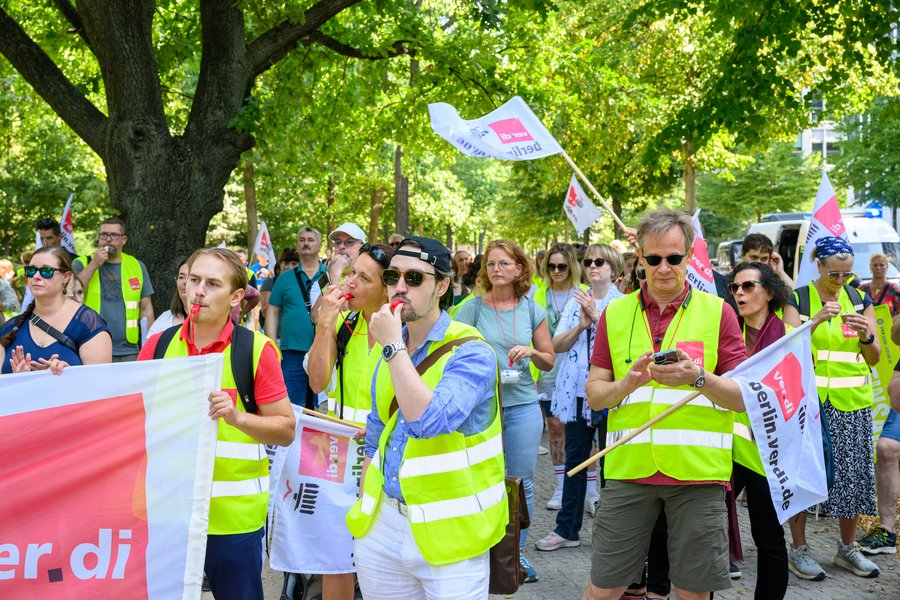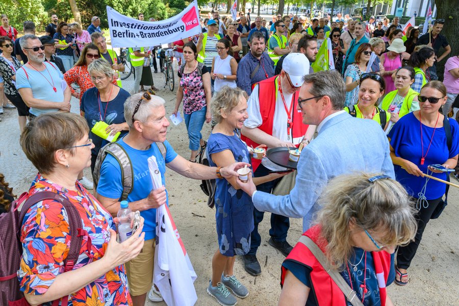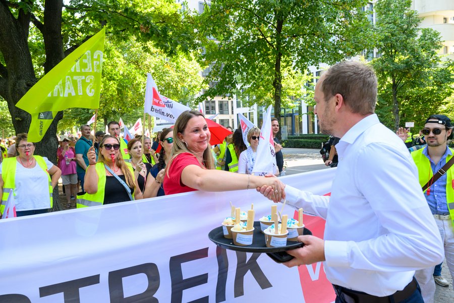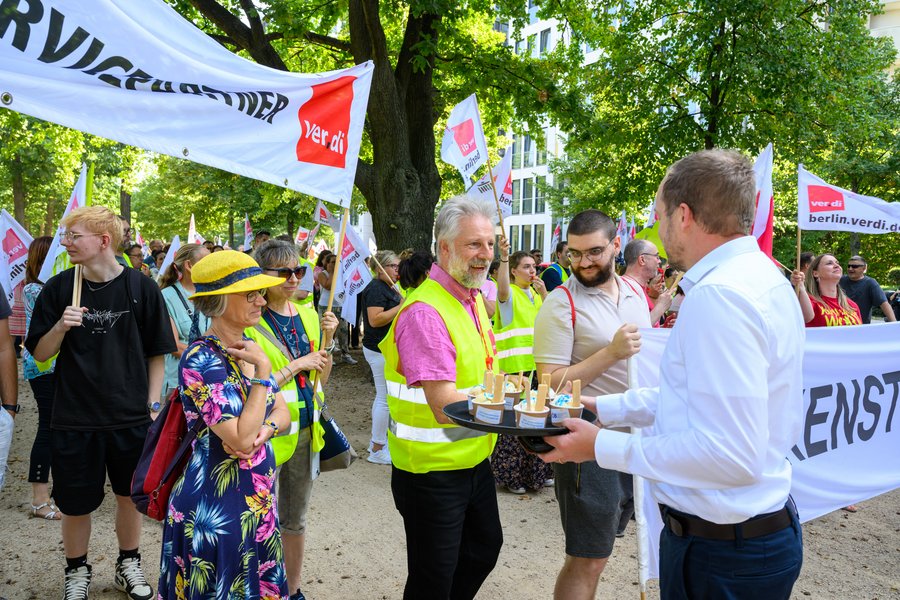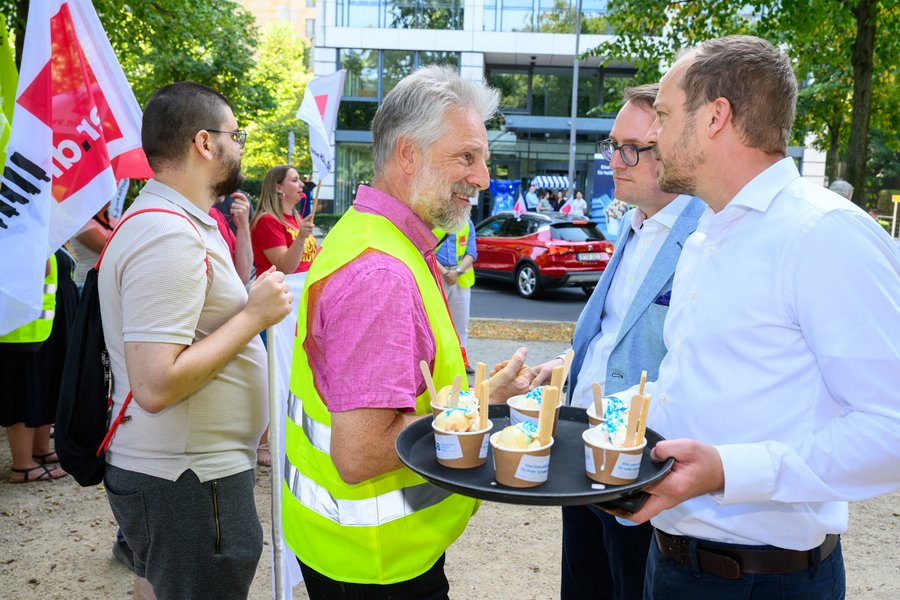 Unter dem Motto „Eine kleine Abkühlung für heiße Verhandlungen“ gab es vor dem Start in die zweite Verhandlungsrunde Eis für die ver.di-Mitglieder, die am 06. September 2024 vor dem Verbandsgebäude in Berlin demonstrierten.