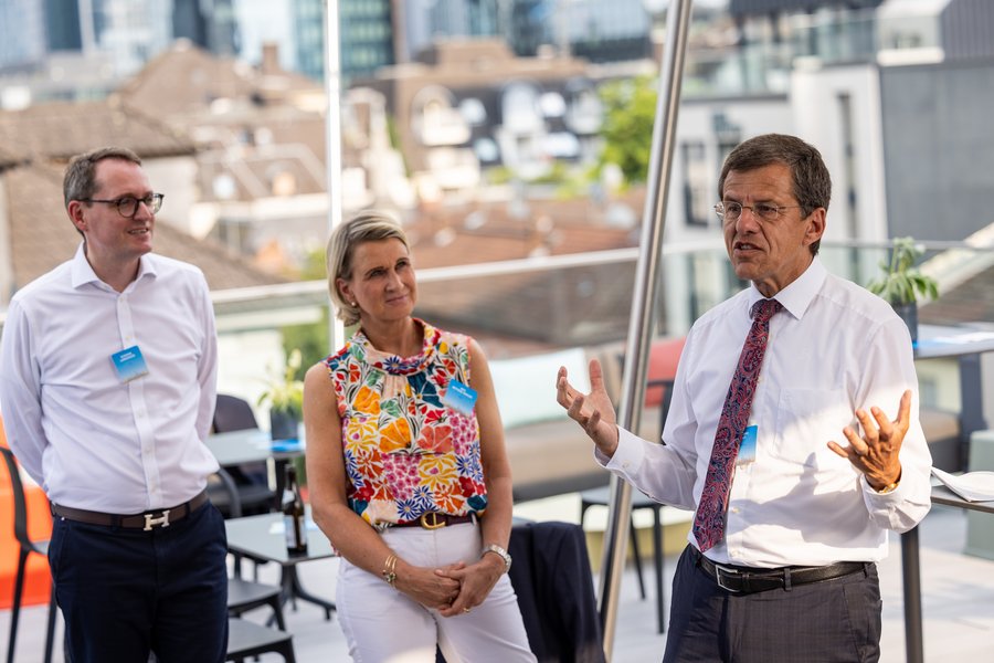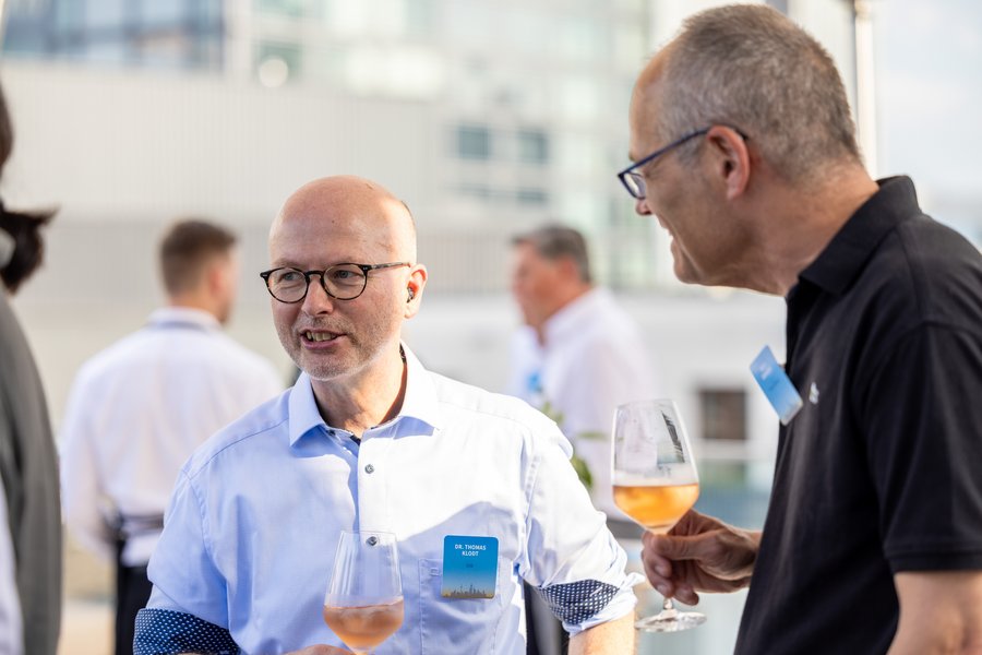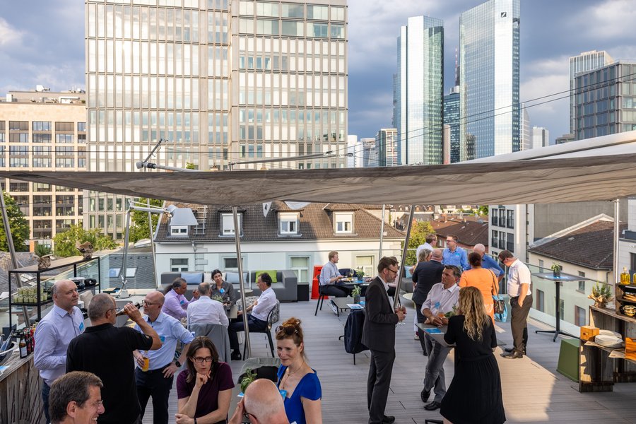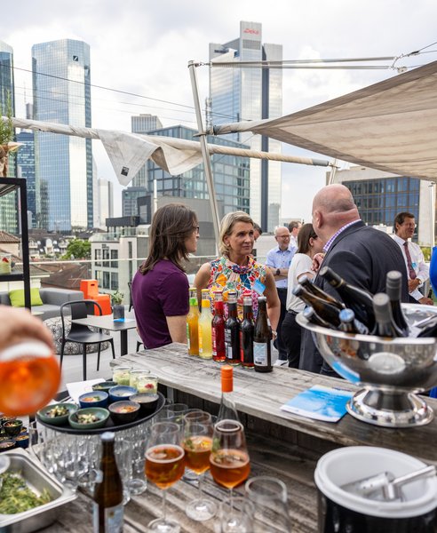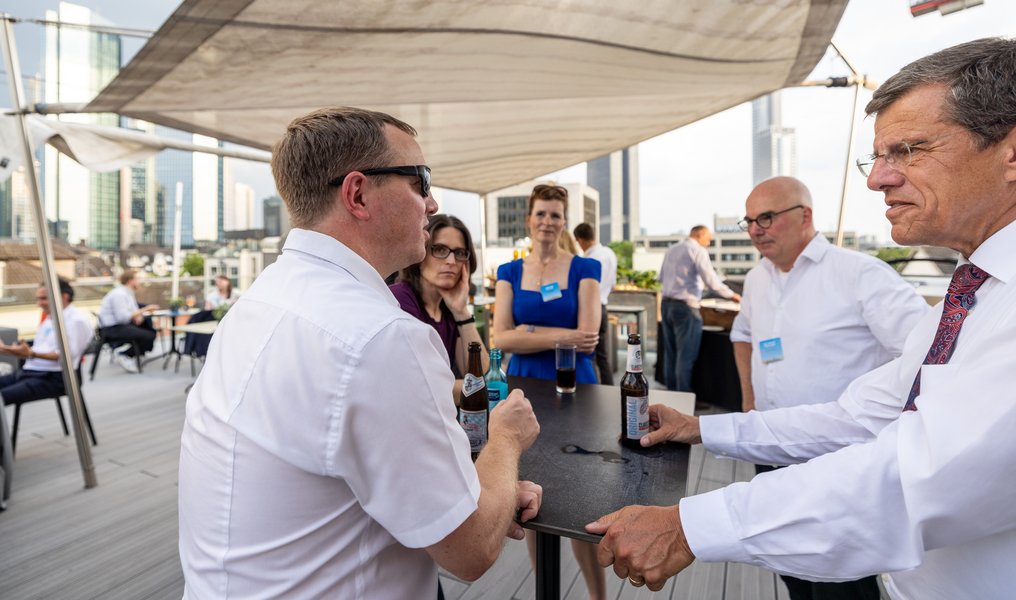 Themen aus der Welt der Finanzen gab es angesichts der umliegenden Bankentürme reichlich. Etliche Gäste zeigten sich aber auch als ausgewiesene Fußballexperten, die mehrheitlich sehr positiv auf die laufende EM blickten.